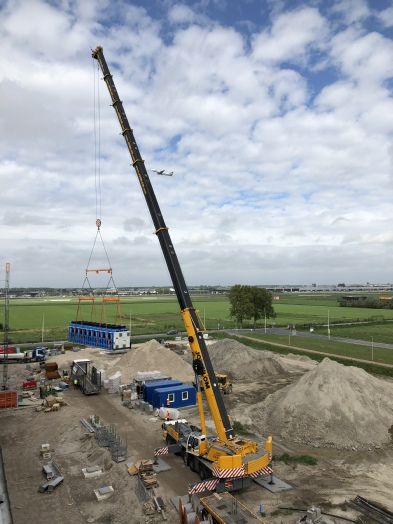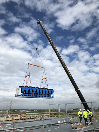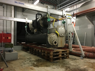 Koelmachine hijsen op dak van datacenter met zware telescoop kraan.