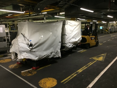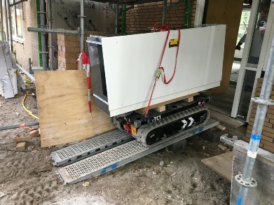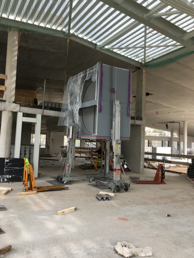 Afvoeren oude luchtbehandelingskast en nieuwe hijsen, intern transporteren en samenbouwen in technische ruimte.